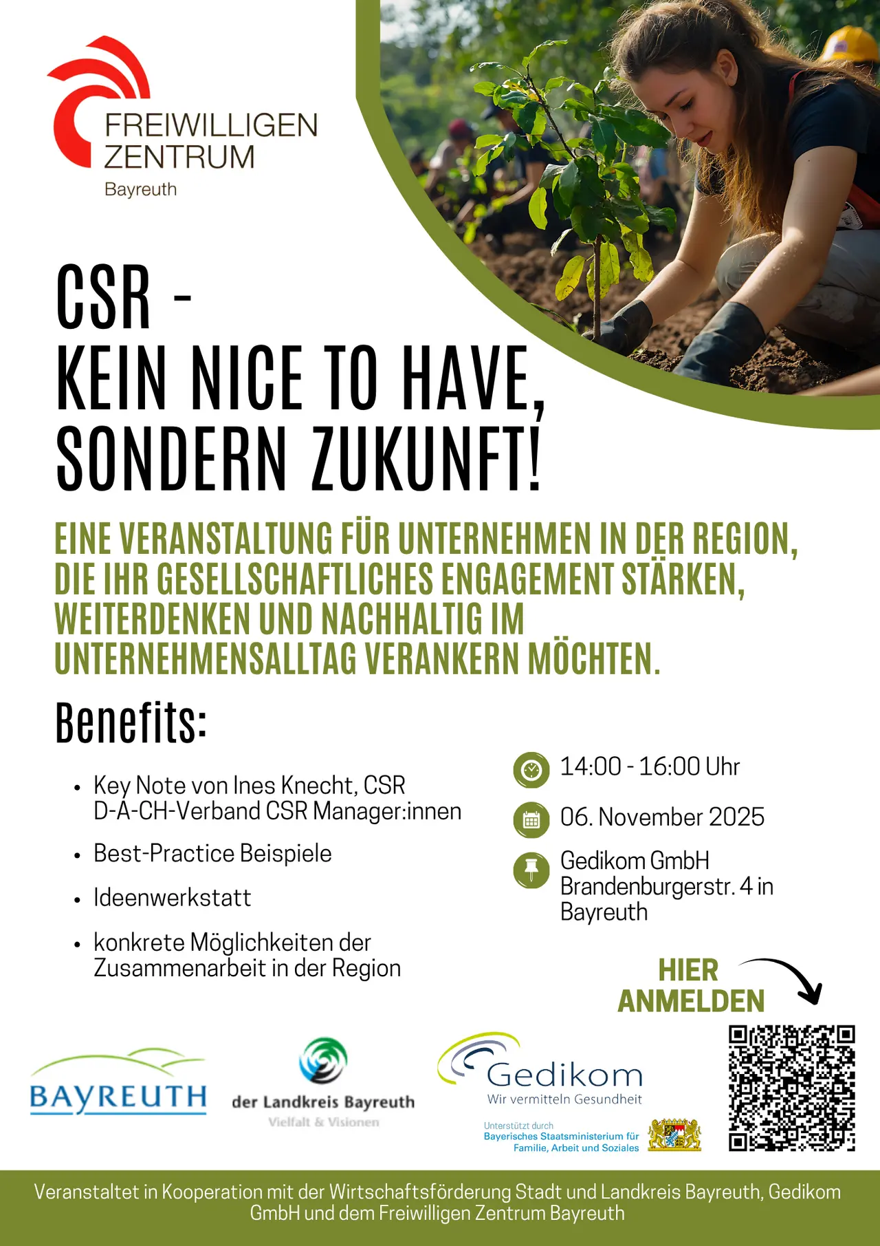 Die Veranstaltung des Freiwilligenzentrums Bayreuth, der Wirtschaftsförderungen von Stadt und Landkreis Bayreuth sowie der Gedikom GmbH bietet die Gelegenheit, sich über erfolgreiche CSR-Ansätze zu informieren, neue Impulse zu erhalten und sich mit anderen Akteuren auszutauschen.